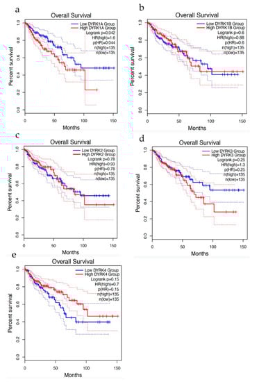 Overall Survival. Using GEPIA2 web server that provide RNA seq from TCGA data set, DYRKs overall survival for CRC patient were investigated. (a) DYRK1A, (b) DYRK1B, (c) DYRK2, (d) DYRK3 and (e) DYRK4.