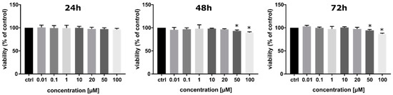 Viability of PC3 cells after 24, 48, and 72 h of incubation with SCNdU in the concentration range from 0.01 µM to 100 µM. The results are shown as the mean ± SD of three independent experiments performed in triplicate. * A statistically significant difference (p < 0.05) is present between the treated samples and control (an untreated sample).