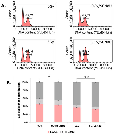 Effect of SCNdU on PC3 cell cycle distribution. (A) Cells were pretreated with SCNdU for 24 h before exposure to 0 Gy or 5 Gy radiation, and the fraction of cells in each phase of the cell cycle was analyzed by flow cytometry. (B) Quantitative analysis of cell cycle distribution. The results are expressed as mean ± SD. Statistical notations for differences in cell populations in G2/M between indicated groups * p < 0.05, ** p < 0.01.
