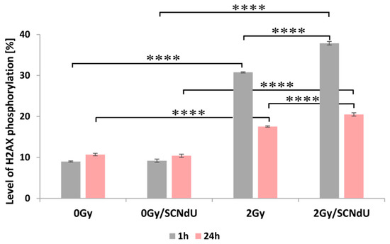 One of the most common types of DNA damage related to radiosensitization is DNA double-strand breaks (DSBs). A molecular marker of this damage is phosphorylation of the H2A.X histone [20]. The cytometric analysis of this process is shown in Figure 4, Figure S3 and Table S1 in the Supplementary Materials. The presented results show that the treatment of cells by SCNdU alone, without exposure to X-rays, did not increase the population of positive cells (for the definition of positive cells population, see caption of Figure 4 and the gating strategy in Figure S3 in Supplementary Material; high fluorescence signal meaning high level of histone phosphorylation related to the appearance of DSBs). However, exposing them to SCNdU followed by irradiation with a dose of 2 Gy increases the level of histone H2A.X phosphorylation from 30.77 ± 0.14% (for the untreated, irradiated culture) to 37.87 ± 0.43%. After 24 h from irradiation (in this time potentially lethal damage repair is complete [21]), the population of positive cells in the irradiated culture assumes 17.54 ± 0.16%, while it increases to 20.49 ± 0.41% for the cells irradiated and pretreated with SCNdU.