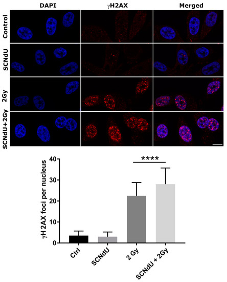 Among different assays for γH2A.X detection, immunofluorescent microscopic γH2A.X foci determination is still considered to be the most sensitive approach. For this reason, the number of foci per nucleus was additionally examined. Figure 5 shows the immunofluorescence staining of (i) irradiated, (ii) SCNdU-treated, (iii) SCNdU-treated and irradiated cells, as well as (iv) the control culture (untreated and unirradiated cells). As shown in Figure 5, SCNdU significantly increased the number of γH2A.X foci per nucleus at 24 h incubation following 2 Gy radiation compared to that of radiation alone (28.1 ± 7.7 compared to 22.5 ± 6.3, p < 0.05). These results suggested that the combination of SCNdU and radiation increased DNA damage.
