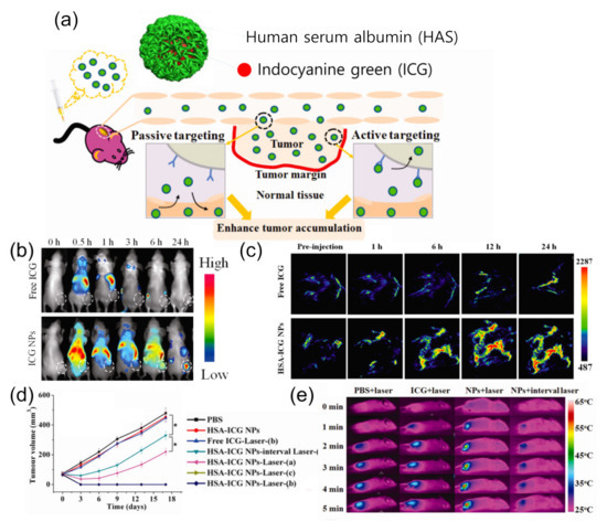 Nanoparticles containing such organic dyes enhance the stability and bioavailability of organic dyes for effective PTT [66]. Nanoparticle carriers protect loaded organic dyes from light, heat, and biomolecules to maintain their chemical structure. Additionally, the long circulation time and tumor-targeting properties improve the bioavailability until they reach the tumor tissues and exhibit their therapeutic effect upon laser irradiation. The enhanced stability and bioavailability of ICG was demonstrated through the encapsulation with lipid polymer nanoparticles [56,57]. The poor aqueous stability and rapid elimination of free ICG were successfully overcome by the nanoparticle formulation. These ICG-loaded nanoparticles had a photothermal effect that increased intratumoral temperature to 50 °C and induced necrosis upon 808 nm laser irradiation. In particular, ICG-loaded human serum albumin (HSA-ICG) nanoparticles showed enhanced cellular uptake and tumor-targeting properties due to the expressed albumin receptors of cancer cells (Figure 2a) [58]. The selective accumulation of HSA-ICG nanoparticles was conspicuous when the biodistribution was compared with that of free ICG (Figure 2b). The tumor-targeting properties were advantageous not only for therapy but also for imaging. Because of fluorescence and photoacoustic property, HSA-ICG nanoparticles visualize tumor tissue with both fluorescent and photoacoustic imaging techniques (Figure 2c). In addition, the flow cytometry of 4T1 cells labeled with propidium iodide and Annexin V-Alexa Fluor 488 proved late apoptosis/necrosis of cancer cells after PTT. As a result, tumor growth was significantly inhibited due to necrosis of tumor tissue induced by the increased temperature at 57 °C upon 808 nm laser irradiation (Figure 2d,e).
