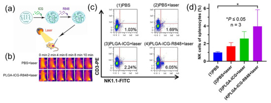 Figure 3. (a) Schematic diagram of PLGA-ICG nanoparticles with R848 for photothermal immunotherapy against RM9-tumor models; (b) thermal images of mice after the subcutaneous injection, followed by laser irradiation; (c) flow cytometry displaying the population of natural killer cells after PTT; (d) increased population of natural killer cells after treatment (* p < 0.05, n = 3). Figures are reproduced from ref. [62] with permission from Dove Press.