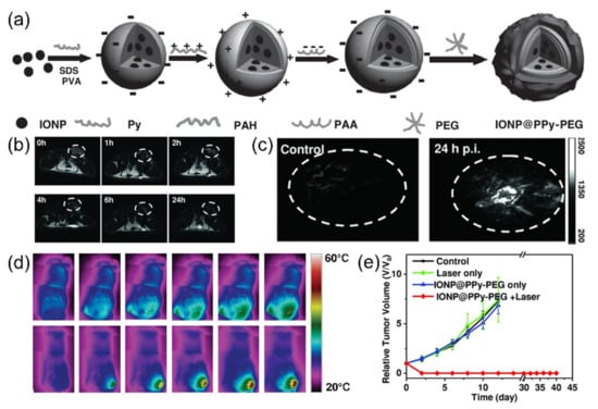 Song et al. developed PEGylated iron oxide nanoparticles doped with polypyrrole, an NIR-absorbing conjugated polymer (IONP@PPy-PEG), as a PTT agent (Figure 4a) [74]. IONP@PPy-PEG was prepared through a layer-by-layer method to obtain water solubility and stability. This excellent biocompatibility enabled the accumulation in the tumor after intravenous injection, which was proved by both MRI (Figure 4b) and photoacoustic imaging (Figure 4c). After 808 nm laser irradiation, the intratumoral temperature increased to 58 °C (Figure 4d), which left a burn on the irradiated tumor area. As a result, tumor volume was successfully suppressed after the treatment (Figure 4e).