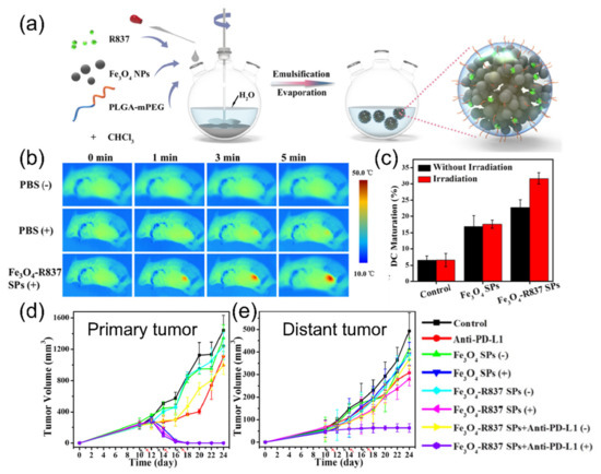 Ge et al. applied iron oxide nanoparticle immunotherapy [83]. Iron oxide nanoparticles were encapsulated in PLGA-PEG copolymer with imiquimod (R837), a Toll-like receptor 7 agonist (Figure 5a). Upon NIR laser (808 nm) irradiation, iron oxide nanoparticles destroyed the 4T1 breast tumor with a photothermal effect (Figure 5b) and triggered the release of tumor-associated antigens. This caused the maturation of dendritic cells for the activation of the immune system (Figure 5c). However, the photothermal effect of iron oxide alone was not effective enough to cause strong immune reactions due to the low extinction coefficient of iron oxide nanoparticles. Released by light-induced heat, R837 worked as an adjuvant and reinforced the effective anti-cancer immune responses. As a result, PTT and systemic anti-cancer immunity removed primary tumors and suppressed tumor metastasis (Figure 5d,e).