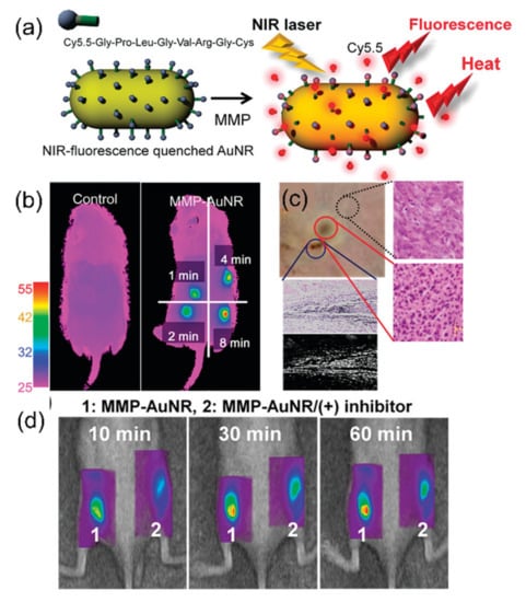 110. Yi, D.K.; Sun, I.-C.; Ryu, J.H.; Koo, H.; Park, C.W.; Youn, I.-C.; Choi, K.; Kwon, I.C.; Kim, K.; Ahn, C.-H. Matrix metalloproteinase sensitive gold nanorod for simultaneous bioimaging and photothermal therapy of cancer. Bioconjugate Chem. 2010, 21, 2173–2177. [Google Scholar] [CrossRef]
