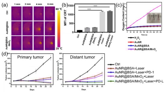 Figure 7. (a) Thermal images of 4T1 tumor area after laser irradiation; (b) expression of CRT after treatments (**** p < 0.0001); (c) oxygen generation curves from the decomposition of H2O2 in the presence of the PTT agent AuNRs; (d) tumor growth curve of primary and distant tumor after treatments (BSA: bovine serum albumin, PD-1: immune checkpoint blockade). Figures are reproduced from ref. [116] with permission from Wiley-VCH GmbH.