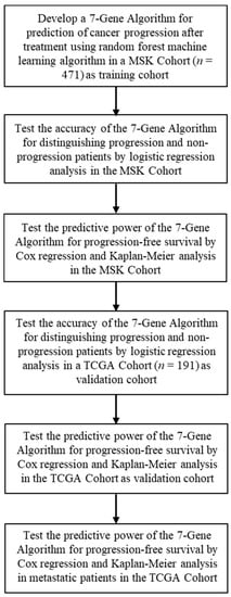A random forest machine learning algorithm screening was performed to select combinations of mutation profiles of the genes in the RAS–RAF–MEK–ERK and PI3K/Akt/PTEN/mTOR pathways, as well as TP53 and APC, which are frequently mutated in CRC, to form classifiers by using the established methods previously described in [28,29,30]. Using the MSK cohort as a training set, the random forest algorithm classifiers, which combine different gene mutation profiles, were used to distinguish progression and non-progression using XLSTAT (Addinsoft, Paris, France). For development of each random forest algorithm, the size of the forest was determined by the number of patients in the cohort (>½ of the patient number). Each tree was developed from a bootstrap sample selected from the training data, with an arbitrary subset of genes being drawn. Confusion matrix of each random forest algorithm to show accuracy for classification of progression and non-progression was used to identify the algorithm with the highest classification accuracy. Further, 10-fold cross-validation was conducted on high-performing gene mutation combinations in a grid search to verify the classification performance and find the best gene combination. Among the algorithms of the gene combinations tested, a 7-Gene Algorithm consisting of KRAS, BRAF, ERBB2, MAP2K1, TSC2, TP53, and APC showed the highest accuracy to distinguish progressed and non-progressed patients after treatment and was chosen as the classifier. With this 7-gene set, the random forest parameters, such as the number of trees and node size, were further tuned to optimize the accuracy and formed the final algorithm for classification of progression and non-progression.