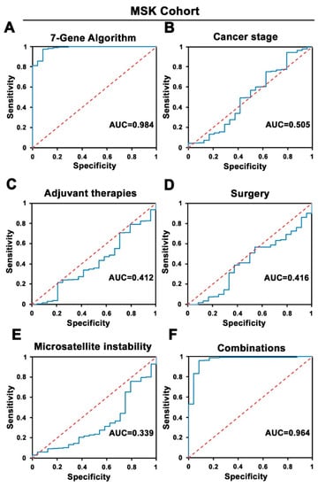 Receiver operating characteristic (ROC) curves of the 7-Gene Algorithm and clinical and pathological indicators for assessment of the performance accuracy for stratification of responder and non-responder group in the MSK cohort. (A) ROC curves of the 7-Gene Progression Algorithm. (B) Cancer stage. (C) Adjuvant therapies. (D) Surgery on primary tumor. (E) Microsatellite instability (MSI). (F) The 7-Gene Algorithm in combination with the parameters listed in (B–E). Sensitivity and specificity are indicated. The AUC values are indicated.