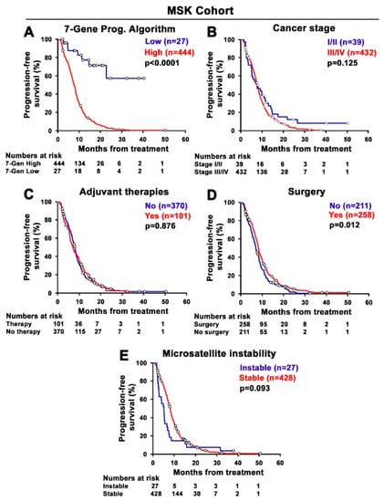 To assess whether the 7-Gene Algorithm might be used as a biomarker to predict progression-free survival (PFS) in the MSK cohort, the log-rank analysis was performed. Kaplan–Meier plot with log-rank analysis revealed that there was a statistically significant difference in PFS between the subgroups stratified based on 7-Gene Algorithm scores. Patients with high scores of the 7-Gene Algorithm in their primary tumor at diagnosis had significantly poorer PFS compared with those with low scores (p < 0.001, Figure 3A). Next, we examined whether the clinical and pathological indicators, including cancer stage (stage I/II vs. III/IV) and adjuvant therapies (therapy vs. no therapy), surgery on primary tumor (surgery vs. no surgery), and MSI type (stable vs. instable), may be used to predict PFS in the MSK cohort. Kaplan–Meier plot with log-rank analysis revealed that there was no statistically significant differences in PFS between subgroups stratified based on the status of cancer stages, therapies, and MSI type (for cancer stage, p = 0.125; for neoadjuvant therapies, p = 0.876; and for MSI type, p = 0.093; Figure 3B,C,E), while there was a small but statistically significant difference between the subgroups stratified based on the surgery status on primary tumors (p = 0.012, Figure 3D).