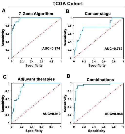 Receiver operating characteristic (ROC) curves of the 7-Gene Algorithm and the clinical indicators for assessment of the performance accuracy in stratification of responder and non-responder group in the TCGA Progression Cohort. (A) ROC curves of the 7-Gene Algorithm. (B) Cancer stage. (C) Adjuvant therapies. (D) The 7-Gene Algorithm in combination with all the above-mentioned clinical indicators. AUC values are shown.