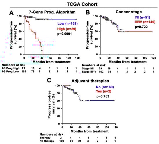 To further validate the performance of the 7-Gene Algorithm as a predictive biomarker for treatment response, Kaplan–Meier analysis was performed using the TCGA cohort. Similar to what was observed using the MSK cohort, patients with high scores of the 7-Gene Algorithm in their primary tumor at diagnosis had significantly poorer PFS compared with those with low scores (p < 0.001, Figure 6A). In this cohort, only two clinical and pathological indicators, cancer stage and adjuvant therapies, were available. We examined whether the clinical and pathological indicators, including cancer stage (stage I/II vs. III/IV) and adjuvant therapies (therapy vs. no therapy), may be used to predict PFS in the TCGA cohort. Kaplan–Meier plot with log-rank analysis revealed that there were no statistically significant differences in PFS between subgroups stratified based on the status of cancer stages or therapies (for cancer stage, p = 0.75; for adjuvant therapies, p = 0.72; Figure 6B,C).