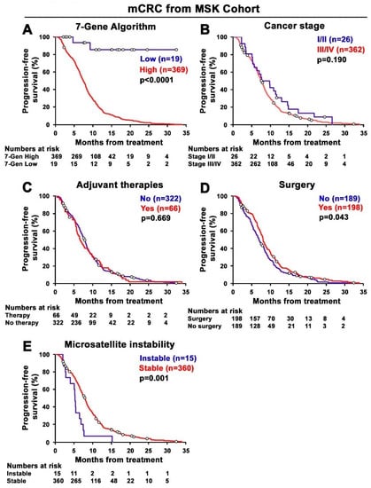 Out of 471 CRC patients, 388 patients had metastatic disease in the MSK cohort (Table 1). In clinical practice, there is no predictive biomarker available to predict treatment response for mCRC patients. We, therefore, wanted to examine whether the 7-Gene Algorithm may be used to predict response for these 388 patients with mCRC. Kaplan–Meier plot with log-rank analysis was performed and revealed that there was a statistically significant difference in PFS between the subgroups stratified based on 7-Gene Algorithm scores in the mCRC cohort. mCRC patients with high scores of the 7-Gene Algorithm in their primary tumor at diagnosis had significantly poorer PFS compared with those with low scores (log-rank p < 0.001; Figure 8A). Similar to what was observed in the total population of the MSK cohort, there was no statistically significant difference in PFS between the subgroups stratified by using pathological indicators, including cancer stage (stage I/II vs. III/IV) and adjuvant therapies (therapy vs. no therapy) (for cancer stage, p = 0.190; for adjuvant therapies, p = 0.669) (Figure 8B,C). Meanwhile, there was a small but statistically significant difference in PFS between the subgroups stratified by using surgery on primary tumor (surgery vs. no surgery) and MSI type (stable vs. instable) (for surgery, p = 0.043, for MSI type, p < 0.001, Figure 8D,E).