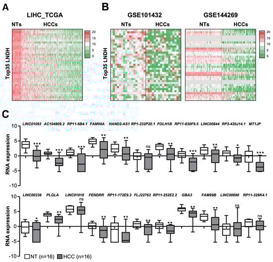 Top-ranked 35 lncRNAs downregulated in HCC (Top35 LNDH). (A,B) Heatmap reporting the expression levels of each of the Top 35 lncRNA (Top35 LNDH) in peritumoral and HCC tissue samples based on RNA-seq data from (A) LIHC TCGA (50 NTs and 374 HCCs), (B) GSE101432 (17 NTs and 17 HCCs) and GSE144269 (70 NTs and 70 HCCs) cohorts. The 35 lncRNAs are ranked according to their log2FC in the LIHC TCGA cohort, being the first one the lncRNA most downregulated. The color scale bar is shown on the right and represents relative expression. Grey color: data not available. (C) Transcript levels (from RNA-seq data expressed as log CPM) of the indicated 22 lncRNAs evaluated in paired peritumoral and tumor samples from a cohort of 16 HCC patients. The result of the statistical analysis is indicated for each lncRNA (HCC versus NT). The U the Mann-Whitney tests were used for statistical analysis. * p < 0.05, ** p < 0.01, *** p < 0.001, ns: nonsignificant differences.