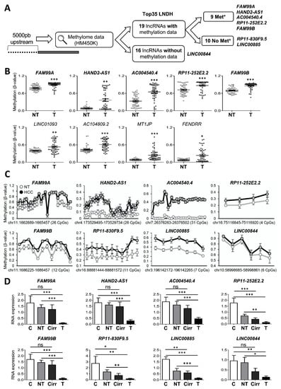 Evaluation of promoter DNA methylation levels of lncRNAs within the Top35 LNDH. (A) Schematic representation of the available methylation data for the promoter region (5000bp upstream lncRNA TSS) of the Top35 LNDH included in the Infinium HumanMethylation450 BeadChip (HM450K). Among the 19 lncRNAs with at least one promoter CpG analyzed in the array, 9 were hypermethylated (Met+). The eight lncRNAs selected for further validation by RT-qPCR and targeted bisulfite sequencing are indicated. (B) DNA methylation levels (β-values) of the most significantly hypermethylated CpG found in the promoter region of the mentioned nine lncRNAs in the 50 patients from the LIHC TCGA cohort for which both peritumoral (NT) and HCC tumor (T) samples were available. The average is indicated as a line. (C) Graphs reporting DNA methylation levels (β-values) obtained by targeted bisulfite sequencing of the promoter regions of the eight selected lncRNAs (see A) in peritumoral and HCC tissues (n = 7). Note that for all lncRNAs analyzed, HCC tissues were hypermethylated compared to paired non-tumoral tissues. (D) Expression level of the eight selected lncRNAs by RT-qPCR in healthy livers (C; n = 6), paired peritumoral and tumor samples (NTs and T; n = 10) and cirrhotic patients (Cirr; n = 12). The levels of RPLP0 mRNA were evaluated and used as a reference to calculate the relative expression. The U the Mann-Whitney test was used for statistical analysis.* p < 0.05, ** p < 0.01, *** p < 0.001, ns: nonsignificant differences.