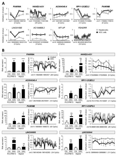 Evaluation of promoter DNA methylation levels of lncRNAs within the Top35 LNDH in human HCC cell lines. (A) DNA methylation levels (β-values) in HCC cell lines (n = 9; FLNEO, H801, HCO2, Hep3B, Huh75, LH86, SNU423, SNU449 and HepG2) and primary hepatocytes (n = 17) from GSE60753, of the CpGs analyzed by the HM450K array within the promoter region of the nine lncRNAs found hypermethylated in human HCC tissues (Figure 2B). The CpGs showed in Figure 2B are indicated as squares. (B) For the eight selected lncRNAs, graphs on the left report the expression levels by RT-qPCR in PLC/PRF/5 and HepG2 cells control or treated with 10 µM of 5-Aza-2′-deoxycytidine (DAC) for seven days. RPLP0 expression was used as a housekeeping gene. At least three independent experiments in duplicate were performed for each cell line. Graphs on the right report DNA methylation levels (β-values) obtained by targeted bisulfite sequencing in PLC/PRF/5 cells control or treated with 10 µM of 5-Aza-2′-deoxycytidine (DAC) for seven days. The Mann-Whitney U test was used for statistical analysis. * p < 0.05, ** p < 0.01, *** p < 0.001, ns: nonsignificant differences.