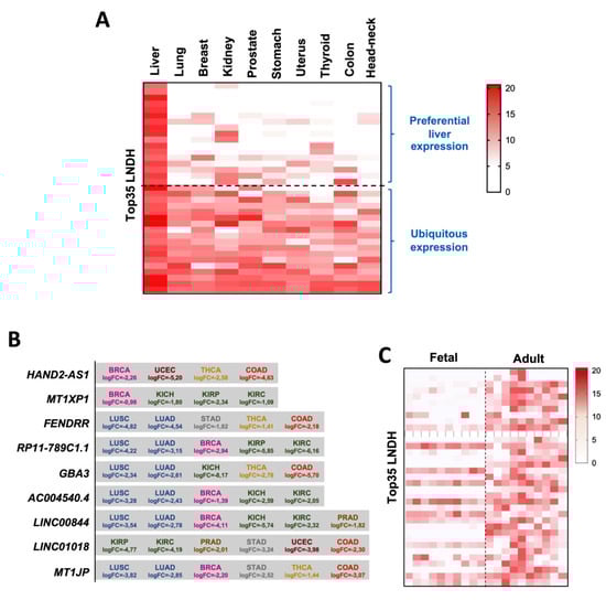 The Top35 LNDH can be divided into two subgroups according to their pattern of expression: preferentially expressed in adult liver and ubiquitously expressed. (A) Heatmap reporting the expression levels of each of the Top35 LNDH in control tissues of different origins from TCGA datasets. Tissue represented: liver (n = 50), lung (LUAD n = 59; LUSC n = 49), breast (n = 113), kidney (KICH n = 24, KIRC n = 72, KIRP n = 32), prostate (n = 52), stomach (n = 32), uterus (n = 35), thyroid (n = 58), colon (n = 41) and head-neck (n = 44). The 35 lncRNAs are ranked according to the number of types of tissues where they are expressed, 17 of them being preferentially expressed in liver, whereas the other 18 showed a ubiquitous expression. The color scale bar is shown on the right representing relative expression. The corresponding ranked list is shown in Supplementary Figure S2A. (B) List of the 9 lncRNAs significantly downregulated in more than four tumor types besides HCC. The tumor type in which each lncRNA is significantly downregulated and the corresponding log2FC are indicated. (C) Heatmap reporting the expression levels of each lncRNA from the Top35 LNDH in fetal and adult liver from GSE111845 (n = 10) ranked as in Figure 4A. The color scale bar is shown on the right representing relative expression.