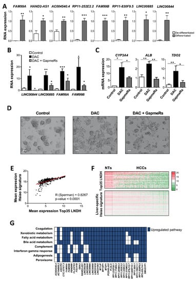 The Top35 LNDH participate in liver differentiation. (A) Expression levels by RT-qPCR of the 8 selected lncRNAs in de-differentiated human hepatoma cell line HepaRG compared to hepatocyte-like well-differentiated HepaRG cells. Experiments were performed at least three times in duplicate. (B,C) Histograms reporting LINC00844, LINC00885, FAM99A, FAM99B (B), CYP3A4, ALB and TDO2. (C) mRNA level by RT-qPCR in HepG2 cells after three days cultured with and without 10 µM of 5-Aza-2′-deoxycytidine (DAC), or after treatment with 10 µM DAC simultaneously to the transfection with a combination of specific GapmeRs for LINC00844, LINC00885, FAM99A and FAM99B. RPLP0 expression was used as a housekeeping gene. All experiments were performed at least three times in duplicate. (D) Representative images of HepG2 cells three days after culture without (control) or with 10 µM of 5-Aza-2′-deoxycytidine (DAC), or after treatment with 10 µM DAC simultaneously to the transfection with a combination of specific GapmeRs for LINC00844, LINC00885, FAM99A and FAM99B. Scale bar 20µm. (E) Graph reporting the positive correlation between the mean expression of the Top35 LNDH and the mean expression of Hsiao liver specific signature (249 liver-specific genes) in the 374 HCC patients from the LIHC TCGA cohort. (F) Heatmap reporting the expression levels of each lncRNA from the Top35 LNDH and each gene from the Hsiao liver specific signature in the 50 peritumoral and 374 HCCs from the LIHC TCGA cohort. Patients are organized according to the highest (left) to the lowest (right) mean expression of the Top35 LNDH. The color scale bar is shown on the right (expressed as relative expression). (G) GBA analysis of the Top35 LNDH. For each lncRNA, the upregulated pathways (FDR<0.05) are shown in dark blue. The Mann-Whitney U test was used for statistical analysis. * p < 0.05, ** p < 0.01, *** p < 0.001.