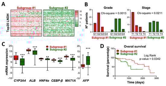 To decipher the clinical relevance of Top35 LNDH expression, we divided HCC TCGA patients in two subgroups according to the level of expression of the Top35 LNDH. Subgroup #1 was formed by the 45 patients with the highest level of expression and Subgroup #2 was formed by the 45 patients with the lowest level of expression (Figure 6A). Interestingly, we found that in agreement with the methylation dependent downregulation of the Top35 LNDH, patients in Subgroup #2 showed significantly higher methylation levels in 7 out of the nine lncRNAs analyzed in Figure 2B and increased expression levels of the three DNA methyltransferases (DNMT1, DNMT3A and DNMT3B) compared with Subgroup #1 (Figure S4B,C). We then compared the demographic and clinical parameters of patients in Subgroup #1 and Subgroup #2. We did not observe any significant association with risk factors; however, our data demonstrated a significant enrichment of Caucasian males in Subgroup #1 and Asian females in Subgroup #2 (Figure S4D). More intriguing, Subgroup #2 with a lower expression of Top35 LNDH was significantly enriched in patients with a higher histological grade (G3 (poorly differentiated) and G4 (undifferentiated)) and pathological stage (T3 and T4) compared with Subgroup #1 (Figure 6B). Accordingly, Subgroup #2 had lower levels of expression of liver specific genes such as CYP3A4, ALB, hepatocyte nuclear factor 4 alpha (HNF4α), CCAAT/enhancer-binding protein beta (C/EBP-β) and methionine adenosyltransferase 1A (MAT1A), together with higher levels of expression of alpha-fetoprotein (AFP) (Figure 6C). Finally, and relevantly, our results showed that lower levels of expression of the Top35 LNDH (Subgroup #2) were significantly associated with a poorer overall survival (log rank p-value = 0.0342; Figure 6D). Interestingly, when we individually analyzed the level of expression of each Top35 LNDH we found that 16 out of the 35 lncRNAs were significantly correlated with overall survival rate (Figure S5), suggesting that their expression could be a good prognostic marker.
