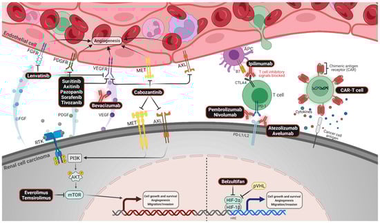 Mechanism of action of experimental and Food and Drug Administration-approved drugs. In this figure, only the major molecules in each pathway are depicted. Created with BioRender.com. Abbreviations: FGF—fibroblast growth factor; FGFR—FGF receptor; PDGF—platelet-derived growth factor receptor; PDGFR—PDGF receptor; VEGF—vascular endothelial growth factor; VEGFR—VEGF receptor; MET—hepatocyte growth factor receptor; RTK—receptor tyrosine kinase; PI3K—phosphoinositide 3-kinase; AKT—protein kinase B; mTOR—mechanistic target of rapamycin complex; APC—antigen-presenting cell; PD-1—programmed cell death protein; PD-L1—PD-1 ligand 1; PD-L2—PD-1 ligand 2; HIF—hypoxia-inducible factor; HRE—hypoxia response element; pVHL—von Hippel–Lindau protein.