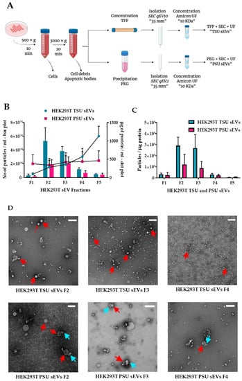 Furthermore, not all laboratories have access to expensive ultracentrifugation devices; therefore, there is still the need to establish a method that can be performed in a laboratory bench setting yet provides sEVs that are qualified to perform both diagnostics and functional studies. To address these important problems, we have optimized two sEV isolation methods by combining tangential flow filtration (TFF) or PEG-based precipitation with conventional size-exclusion chromatography and ultrafiltration (SEC + UF) techniques, which we named TSU and PSU, respectively. The fractions were characterized according to the MISEV2018 guidelines [3]; the majority of small extracellular vesicles (sEVs) ranging from 30–200 nm were obtained in fraction 2 (F2) and fraction 3 (F3) of TSU and PSU.