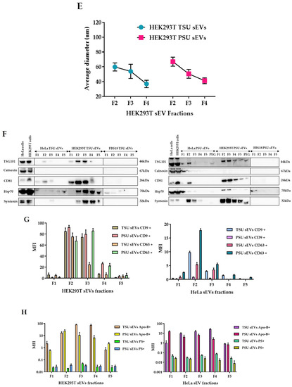 Next, we performed bead-assisted flow cytometry for further qualitative characterization of sEV fractions since this method is sensitive and time saving. To do so, we determined the level of surface-EV markers (CD9 and CD63 tetraspanins) and non-small EV contaminants such as phosphatidylserine (PS+) apoptotic bodies and apolipoprotein-B (Apo-B) in all sEV fractions [39]. Positive populations were selected as shown in Supplementary Figure S1F,G. As expected, CD9 and CD63 are primarily present in F2 and F3 of TSU and PSU sEVs from HEK293T cells. In line with the WB results, we observed that CD9 and CD63 signals are weaker in HeLa sEVs irrespective of the isolation method used (Figure 1G). EV purity was also calculated based on the EV tetraspanin value obtained from flow cytometry and free protein concentration determined by micro-BCA. Indeed, we determined that fractions F2 and F3 have more EV purity than other fractions (Supplementary Figure S1H). Interestingly, we found that the level of PS+ apoptotic bodies is close to zero in all TSU and PSU sEVs (F1–F5), indicating their absence. On the other hand, Apo-B contamination was lower in PSU sEVs than in TSU sEVs (Figure 1H). Overall, our results indicate that both TSU and PSU methods are able to isolate sEVs with high purity.