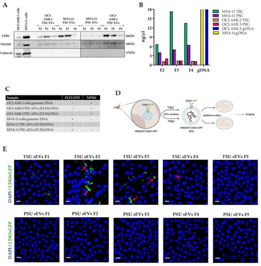 TSU and PSU sEV fractions (F2–F4) obtained from MV4−11 and OCI−AML3 CCM were characterized by performing Western blot with CD81, TSG101, and calnexin. EV-DNA was isolated from these fractions using the QIAamp DNA Micro Kit (#56304, Qiagen) according to the manufacturer’s instructions, and the concentration was determined using a Nanodrop 1000 spectrophotometer (ThermoFisher Scientific, Waltham, MA, USA). As shown before, GeneScan-based fragment-length analysis was performed to determine if MV4−11 and OCI−AML3 TSU and PSU sEVs (F2–F4) qualify to detect AML-specific mutations (FLT3 and NPM1 mutations) [21].