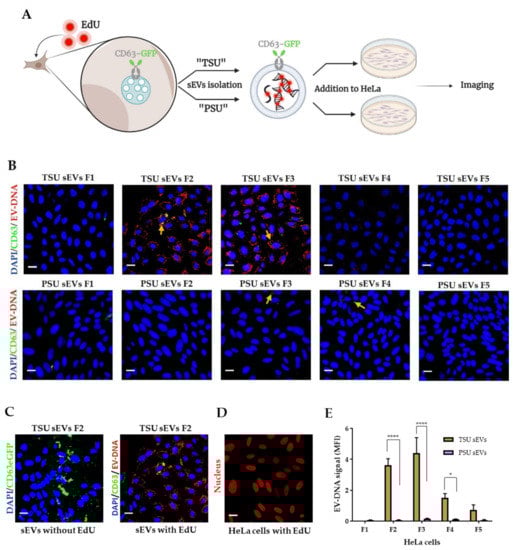 In order to facilitate EV-DNA-based functional studies, 5 µM of 5-ethynyl-2′-deoxyuridine (EdU; ThermoFisher Scientific) solution was added to HEK-CD63-GFP cells after a few hours of seeding (i.e., when cells had attached to the dishes). EdU is a thymidine analog incorporated into newly synthesized DNA during active DNA synthesis; thereby, cells treated with EdU release EVs in which DNA is labeled with EdU. sEVs were isolated from HEK-CD63-GFP cells treated with EdU using TSU and PSU.