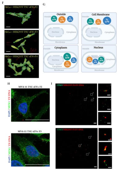 To precisely visualize and measure the amount of EV-DNA localized in various cell compartments such as the cell membrane, cytoplasm, and nucleus, we analyzed the reconstructed confocal z-stacks of confocal images containing EV-DNA first-ever using Imaris software. Briefly, deconvolution of data sets was performed using Huygens, and the Imaris surface function was used to distinguish different cell compartments, which helped quantify accurately the amount of EV-DNA localized inside the recipient cells, avoiding false-positive results or artifacts generated from 2D microscopy (Figure 3F). Indeed, we observed that only ~50% of EV-DNA from F2 and F3 and 25% from F4 successfully passed through the cell membrane barrier and localized inside the recipient cells, while others were found outside the cells and at the cell membrane. We found nearly the same amount of EV-DNA (F2 and F3) inside the recipient cells both in the cytoplasm and in the nucleus. However, it is significantly less in F4, which explains that there is a different DNA population present in this fraction (Figure 3G). To confirm if the EV-DNA-EdU transfer approach could be used for any disease model, we incubated leukemia cell line MV4-11-derived sEVs containing EV-DNA-EdU with mouse mesenchymal stromal cells, OP9. Indeed, we observed that MV4-11-EV-DNA was transferred into OP9 cells, which shows that this approach could be used to evaluate the EV-DNA role in cell–cell communication in leukemia (Figure 3H). Next, to analyze EV-DNA organization at a single vesicle level, we imaged HEK-CD63-GFP TSU sEVs (F2 and F3) mounted on poly-L lysine coated coverslips using super-resolution microscopy (Figure 3I). Indeed, we observed that most of the EV-DNA (red) signal was found next to CD63+ EVs (green), indicating that these are intravesicular EV-DNA fragments protected inside the vesicles. However, a small proportion of EV-DNA co-localized with CD63 GFP + EVs revealing the possibility that they are extra vesicular DNA.