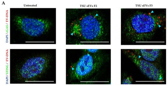 In recent years, it was found that DNA from various sources could enter the cytosol and activate the cGAS-STING pathway: a DNA-driven immune response critical in host defense, inflammation, and tumor immunity [29,30,48]. Interestingly, we observed the co-localization of cGAS and STING with EV-DNA in HeLa cells, suggesting their molecular interaction (Figure 5A).