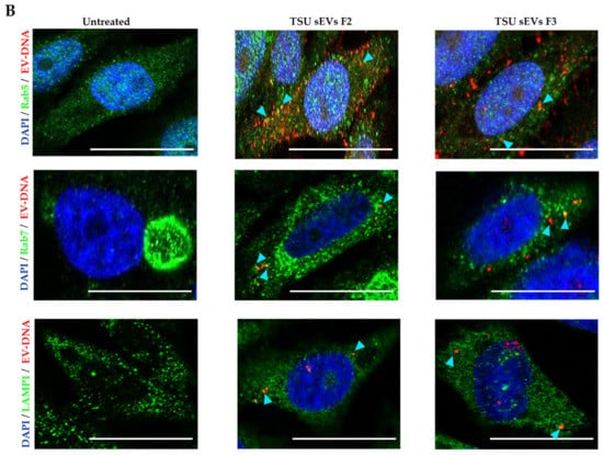 To determine if EV-DNA is considered to be a potential threat inside the recipient cells directing towards endosomal fusion and degradation in the lysosomal compartment, HeLa cells incubated with EdU-labeled F2 and F3 HEK293T TSU sEVs were stained for Rab5 and Rab7 proteins (early and late endosomal markers) and LAMP1 (lysosomal autophagy marker). Further elucidating the previous observations by Rappa et al. [49], we found that a portion of EV-DNA associates with Rab5 and Rab7 (Figure 5B). In addition, the co-localization of EV-DNA with LAMP-1 highlights that they are in the process of degradation.