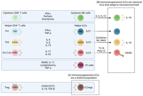 ILCs, including ILCregs, are classified based on functional similarities to T cell counterparts. The conventional members of ILCs (i.e., NK cells, ILC1s, ILC2s, ILC3s) were categorized based on their similarities in expression of transcription factors and cytokines to T cells (i.e., CD8+ T cells, Th1, Th2, and Th17 CD4+ helper T cells). Based on our current understanding, immunosuppressive ILCs could be added to the current classification as (A) a distinct population of cells (i.e., ILCregs) that share immunosuppressive features with Tregs or (B) as an extension of conventional ILCs that adopt suppressive features (e.g., IL-10, OX40L) following stimulation with the appropriate microenvironmental signals.