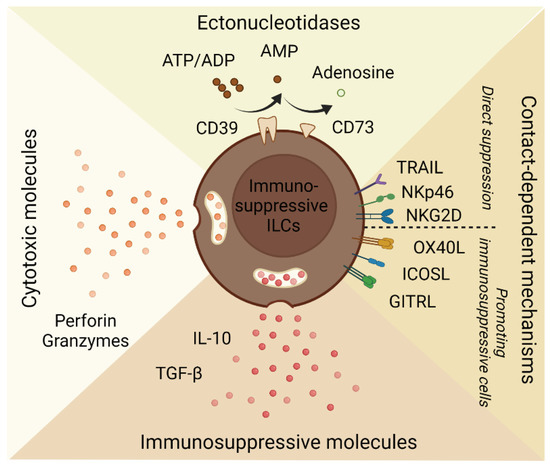 Mechanisms of immunosuppressive ILCs. Immunosuppressive ILCs have been shown to suppress immune responses through ectonucleotidases (e.g., CD39, CD73), killing of immune cells through cytotoxic molecules (e.g., perforins, granzymes) or contact-dependent mechanisms (e.g., TRAIL, NKp46, NKG2D), and soluble mediators (e.g., IL-10, TGF-β). Immunosuppressive ILCs can promote other suppressor cells through expression of OX40L, ICOSL, and GITRL.