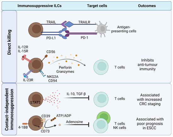 ILCs suppress anti-tumour immunity through contact-dependent and contact-independent mechanisms. ILCs play active roles in suppressing T-cell-mediated clearance of tumours through direct-killing of T cells using perforin and granzymes, production of immunoregulatory molecules (e.g., IL-10 and TGF-β), and conversion of ATP into suppressive adenosine through ectoenzymes (e.g., CD39, CD73). Furthermore, ILCs directly kill antigen-presenting cells (APCs) preventing them from cross-priming CD8+ T cells in the lymph nodes.