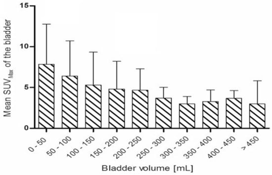 The median bladder volume was 67 mL [IQR 46–97] and significantly smaller in the patient group with an SUVmax of >10.0 (p ≤ 0.001) (Table 1). Hence, the mean SUVmax in the bladder decreased in a higher-volume bladder, as seen in Figure 1.