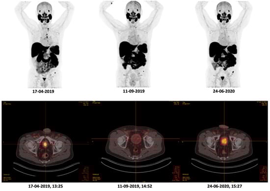 In recent years, the use of positron emission tomography (PET) probes targeting prostate-specific membrane antigen (PSMA) to image prostate cancer (metastases) has attracted broad attention [6,7,8]. Numerous studies have shown that commonly used PET radiotracers such as [68Ga]Ga-PSMA-11, [18F]DCFPyL and [18F]PSMA-1007 provide promising opportunities to localize prostate cancer and its metastases [2,9,10,11,12]. The use of this imaging modality improves the management of prostate cancer patients as it outperforms conventional imaging (e.g., computer tomography, bone scintigraphy) [9,11,13,14,15].