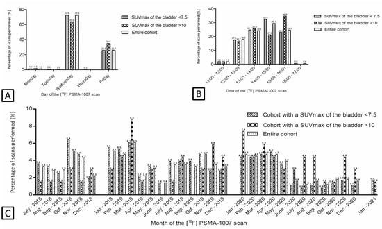 Percentage of scans performed for the cohort with an SUVmax of the bladder < 7.5, SUVmax of the bladder >10 and for the entire cohort stratified by day (A), time (B) and month (C) of the [18F]PSMA-1007 PET/CT. PSMA: prostate-specific membrane antigen; SUV: standardized uptake value.
