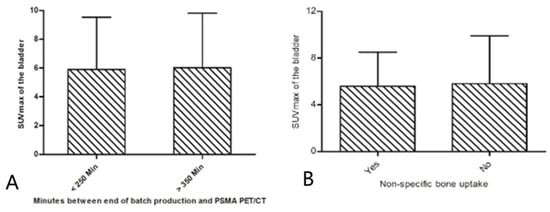 Mean SUVmax (SD) of the bladder stratified by minutes between batch production and PSMA PET/CT (A) and presence of increased general bone uptake (B). SD: standard deviation; PSMA: prostate-specific membrane antigen; PET: positron emission tomography; CT: computed tomography; SUV: standardized uptake value; PSA: prostate-specific antigen; Min: minute.