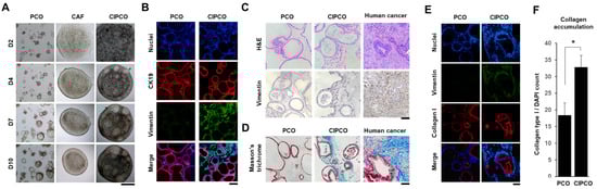 Development of cancer-associated fibroblast (CAF)-integrated pancreatic cancer organoid (CIPCO) model and its morphologic characteristics. The CIPCOs were incubated for 2–10 days at 37 °C under 5% CO2. CIPCO analysis was performed on day 5. (A) Bright-field images of pancreatic cancer organoids (PCOs), CAFs, and CIPCOs on days 2, 4, 7, and 10. Bar = 500 μm. (B) Immunofluorescence images of the PCO and CIPCO models labeled with CK19 and vimentin. Bar = 100 μm. (C) Comparison of H&E and vimentin-stained images of PCOs, CIPCOs, and human pancreatic cancer tissues. Bar = 200 μm. (D) Comparison of Masson’s trichrome-stained images of PCOs, CIPCOs, and human pancreatic cancer cells. Bar = 500 μm. (E) Immunofluorescence images of PCOs and CIPCOs labeled with collagen I. Bar = 100 μm. (F) Quantitative analysis of the relative fluorescence intensity of collagen I in PCOs and CIPCOs. (n = 6) * p < 0.05.