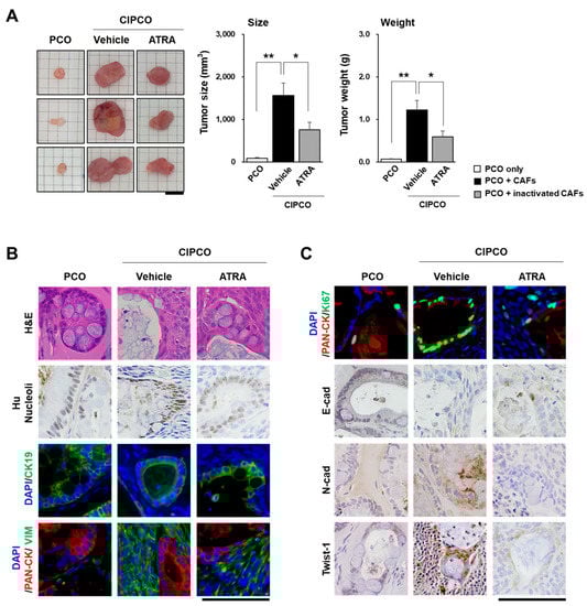 Characteristics of the tumors in xenograft models of PCOs, CIPCOs, and ATRA CIPCOs. (A) Comparison of tumor size and weight between the three groups. (n = 5) * p < 0.05, ** p < 0.01. Bar = 1 cm. (B,C) Immunofluorescence/immunohistochemical analysis of PCO, CIPCO, and ATRA CIPCO xenograft tumors. Bar = 100 μm.