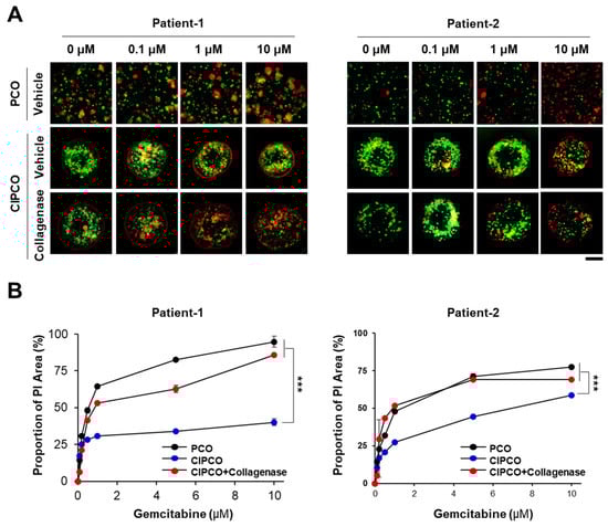 Sensitivity of cancer cells to gemcitabine in PCO and CIPCO models. (A) Immunofluorescence detection of propidium iodide (PI) in PCOs and CIPCOs treated with various concentrations of gemcitabine (range: 0.1–10 μM). For the CIPCO, collagenase (100 ng/mL) was added. (green: live PCOs; red: dead cells). (B) Quantitative analysis of PI-positive areas. PI-positive areas were calculated using Gen5 Image Prime 3.08 (Biotek). Bar = 200 μm. *** p < 0.001.