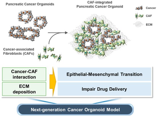 Diverse types of organoids have been derived directly from various human tissues [13,14]. Organoid technology has been applied to the study of cancer, and cancer organoids are attracting attention as a promising preclinical model. However, because most cancer organoids are composed of cancer cells and do not contain TME elements, cancer organoids alone do not represent the full spectrum of human cancers. Thus, disease progression or drug resistance induced by the TME cannot be properly evaluated or predicted using this simple cancer organoid model. Here, we aimed to develop a clinically relevant organoid model by integrating CAFs into pancreatic cancer organoids.