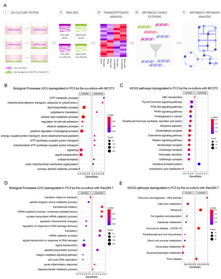 Schematic representation of the indirect co-culture system and alterations of tumor cells’ metabolic profile induced by the co-culture with bone progenitors. (A) PC3 cells were cultured alone or co-cultured with bone progenitors (MC3T3 or Raw264.7) using an in vitro bio-compartment, which allows cells to share the culture medium and signaling factors without physical contact, in order to mimic the interactions between tumor cells and the bone metastatic niche through soluble factors. Cells were seeded in their respective compartments and after 24 h the inserts containing PC3 cells were washed and placed in the co-culture plates with or without osteoblast/osteoclast precursor cells. On day 3, PC3 cells were harvested, RNA was extracted and an RNA-seq with differential expression analysis was performed. The DEG’s associated with metabolism categories were identified using Reactome. (B–D) Enrichment plots (GSEA) showing the significantly activated and repressed categories after the co-culture of PC3 cells with either osteoblast or osteoclast precursor cells. (B) Gene ontology (GO) biological processes categories and (C) KEGG pathways significantly dysregulated in PC3 cells after the co-culture with MC3T3 cells. (D) GO biological processes categories and (E) KEGG pathways significantly dysregulated in PC3 cells after the co-culture with Raw264.7 cells. The size of the dots represents the number of counts observed for each category, and the color gradient shows the p value. Statistical significance was set at p < 0.05.