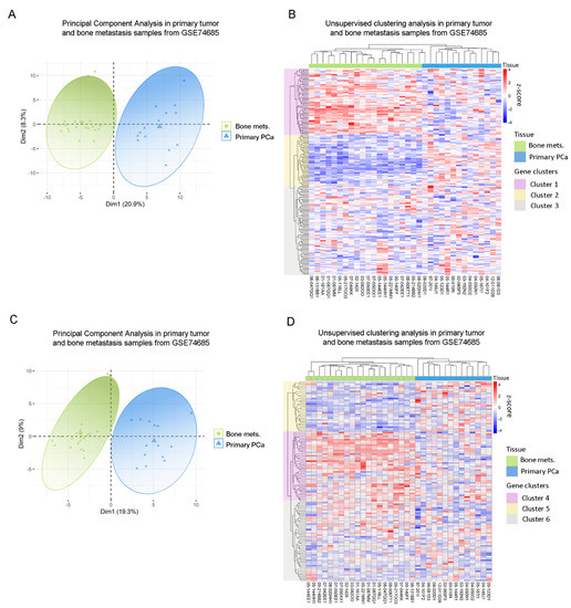 Clinical correlation of metabolic genes dysregulated in PC3 by the co-culture with bone progenitors. (A) Principal Component Analysis (PCA) biplot considering the expression of the metabolic genes identified in PC3 cells co-cultured with MC3T3 showing a rough segregation of primary tumors (blue) and bone metastases samples (green). Each point represents one sample from the GSE74685 dataset. (B) Heatmap depicting an unsupervised clustering analysis in human primary tumor and bone metastases samples, considering the expression of metabolic genes dysregulated in PC3 cells co-cultured with MC3T3 cells. (C) PCA biplot considering the expression of the metabolic genes identified in PC3 cells co-cultured with Raw264.7 showing a rough segregation of primary tumors (blue) and bone metastases samples (green). Each point represents one sample from the GSE74685 dataset. (D) Heatmap depicting an unsupervised clustering analysis in human primary tumor and bone metastases samples, considering the expression of metabolic genes dysregulated in PC3 cells co-cultured with Raw264.7 cells. Red, white and blue colors represent higher, equal or lower z-score expression levels, respectively. Each green or blue box at the top of the heatmap represents a bone metastasis or primary tumor sample, respectively. Purple, yellow and gray boxes on the left side of the heatmap enclose genes classified in Cluster 1, 2 and 3, or 4, 5 and 6, respectively. Statistical significance was set at p < 0.05.