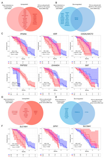 Dysregulated metabolic-related genes in co-cultured PC3 cells compared to PC3 grown alone, and in metastatic compared to primary PCa samples. (A,B) Venn diagram showing the upregulated (A) or downregulated (B) genes obtained from a differential expression analysis performed on patients’ bone metastases vs. primary tumor samples (GSE74685), and the significantly upregulated/downregulated genes in PC3 co-cultured with MC3T3 cells. (C) Kaplan–Meier (KM) curves using the SU2C-PCF dataset for overall survival (OS) of PCa patients segregated based on the expression levels of the clinically relevant metabolic-associated genes identified in both the co-culture system with MC3T3 cells and the GSE74685 dataset. (D,E) Venn diagram showing the upregulated (D) or downregulated (E) genes obtained from a differential expression analysis performed on patients’ bone metastases vs. primary tumor samples (GSE74685), and the significantly up/down regulated genes in PC3 co-cultured with Raw264.7 cells. (F) KM curves using the SU2C-PCF dataset for OS of PCa patients segregated based on the expression levels of the clinically relevant metabolic-associated genes identified in both, the co-culture system with Raw264.7 cells and the GSE74685 dataset. The optimal cutoff value for gene expression was determined using the Cutoff Finder tool. All comparisons consider low expression patients as the reference group. OS of patients with high (red) vs. low (blue) expression for each gene. HR = hazard ratios [95% confidence interval]. All comparisons consider low expression patients as the reference group. Cox p = Cox proportional hazard model p value. Statistical significance was set at p < 0.05.