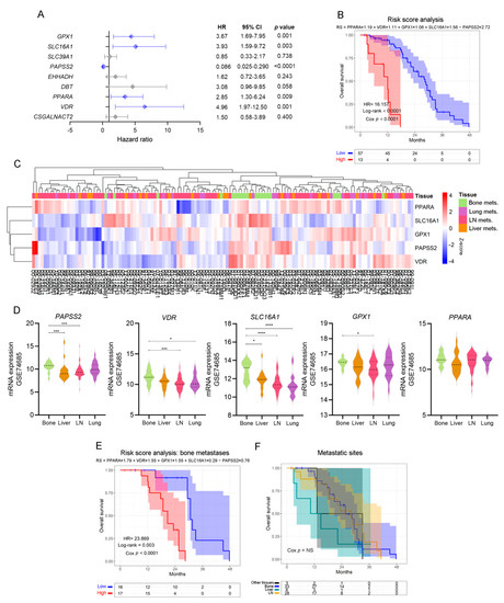 When re-interrogating the GSE74685 dataset, the expression of these five factors was able to discriminate bone metastases from other metastatic sites (Figure 4C): PAPSS2 was significantly higher in bone vs. liver and lymph node (LN), VDR was higher in bone vs. LN and lung, SLC16A1 was higher in bone compared with liver, lung and LN, and GPX1 was higher in bone vs. LN metastases (Figure 4D). PPARA had no significant differences (Figure 4D). When assessing the signature taking into consideration only bone metastatic samples, we observed that the hazard ratio was even higher (HR = 23.869, p < 0.0001) in the subgroup with high-risk score for the selected signature (Figure 4E and Supplementary Table S3B). Of note, in the SU2C-PCF dataset, patients’ survival was not dependent on the metastatic site itself (Figure 4F). Thus, these results demonstrate that transcriptomic changes of a discrete metabolic gene signature are associated with significant changes in OS, highlighting their clinical relevance for metastatic PCa.