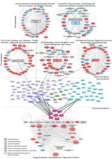 We identified 65 murine proteins secreted by MC3T3 cells and 38 proteins secreted by Raw264.7 cells upon co-culture with PC3 cells (Figure 5, medium panel and Supplementary Tables S4 and S5, respectively). Protein–protein interaction analyses between the secretome of each co-culture and the regulatory (RxA/B suffix) and catalytic (CA/B suffix) subunits of PKA (PRKAR1A, PRKAR1B, PRKAR2B, PRKAR2A, PRKACA and PRKACB) revealed several factors secreted by pre-osteoblasts (Col1a1, Sik2, Cacna2d1, Crebbp, Graf2, Kdm3b and Fn1) and pre-osteoclasts (Cul3 and Ift140) during the co-culture with PC3 cells that interact and/or influence PKA activity (Figure 5, medium panel). Of note, Fn1 and Col1a1 are critical for extracellular matrix organization and bone remodeling. Additionally, MC3T3 and Raw264.7 RNA-seq data showed that genes encoding these proteins were significantly upregulated by the co-culture with PC3 cells (Figure 5, upper panel). Furthermore, IPA revealed that these proteins were involved in cell-cell interactions, cell migration and tissue morphology networks (Figure 5, upper panel).