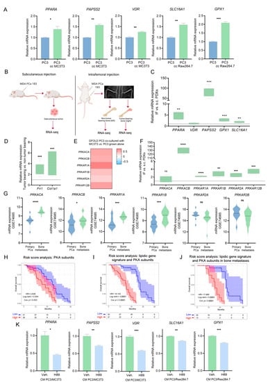 Role of PKA in the metabolic phenotype of co-cultured PC3 cells. (A) Gene expression validation of the lipid-associated gene signature by RT-qPCR in PC3 grown alone (PC3; control) and in PC3 co-cultured with MC3T3 or Raw264.7 cells (PC3 cc MC3T3 and PC3 cc Raw264.7, respectively). The values were normalized using PPIA as a reference gene and relativized to the controls. t-Test was used to assess statistical significance. Results are shown as the mean ± S.E.M. (B) Schematic representation of subcutaneous (left panel; s.c.) and intrafemoral (right panel; IF) implantation of MDA-PCa-183 PDX in male CB17 SCID mice and samples subsequently processed for RNA-sequencing. In the intrafemoral injection, the X-ray radiograph depicts a mouse pelvis and rear limbs at 5 weeks post-intrafemoral implantation of MDA-PCa-183-derived cells. Left legs were sham-injected non-tumor-bearing controls. (C) Box plots depicting IF vs. s.c. relative gene expression of PPARA, VDR, PAPSS2, GPX1 and SLC16A1 in MDA-PCa-183 PDX. Expression values for each gene were normalized using PPIA as a reference gene and IF was relativized to s.c. t-Test was used to assess statistical significance. (D) Box plots depicting gene expression values for Col1a1 and Fn1 in MDA-PCa-183 tumor-bearing vs. non-tumor-bearing bones. t-Test was used to assess statistical significance. Expression values for each gene were normalized using PPIA as a reference gene and expression in tumor-bearing bones was relativized to the expression of non-tumor-bearing bones. (E) Heatmap showcasing the expression (GFOLD) of PKA subunits in PC3 cells co-cultured with MC3T3 compared with PC3 grown alone. Color scale ranges from blue (GFOLD = −0.7) to white (GFOLD = 0) to red (GFOLD = 0.7). (F) Box plots depicting IF vs. s.c. relative gene expression PKA subunits in MDA-PCa-183 PDX. Expression values for each gene were normalized using PPIA as a reference gene and IF was relativized to s.c. t-Test was used to assess statistical significance. (G) Violin plots showcasing gene expression levels of the PKA subunits in bone metastasis and primary PCas from the GSE74685 dataset. Wilcoxon test was used to assess statistical significance. (H–J) KM curves for OS in high-risk (red) and low-risk (blue) groups, according to a risk score model based on the expression of PKA subunits (H) and PKA subunits and the lipidic gene signature (I) in all patients, or on the expression of PKA subunits and the lipidic genes signature in bone metastatic patients from the SU2C-PCF dataset (J). (K) Gene expression levels for PPARA, PAPSS2, VDR, SLC16A1 and GPX1 in PC3 cells treated with the conditioned media (CM) of the PC3/MC3T3 or PC3/Raw264.7 co-cultures, and treated with the PKA inhibitor H89 (10 µM, 3 h) or DMSO (Veh.; control). The values were normalized using PPIA as a reference gene and relativized to the controls. One representative of at least three independent experiments is shown. Results are shown as the mean ± S.E.M. t-Test’s statistical significance was set at p < 0.05. Statistical significance: p < 0.05. * p < 0.05, ** p < 0.01, *** p < 0.001, **** p < 0.0001, ns = not significant.