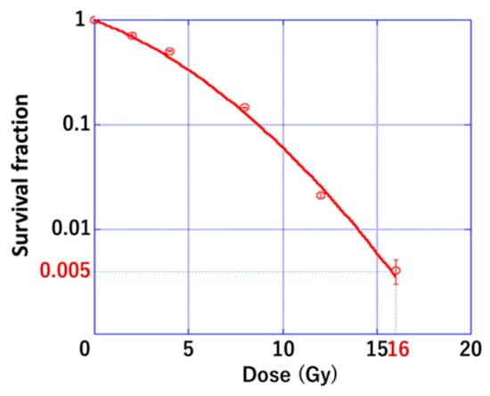 As shown in Figure 1, 16 Gy in a single fraction provided 0.5% survival. Therefore, 16 Gy was used in a single fraction, or its biological equivalent, 8 Gy × 3 fr, which was estimated by the concept of biological effective dose with the LQ model []. The detail of the derivation of the hypofractionated radiation dose from 16 Gy in a single fraction is provided in the Supplementary Materials.
