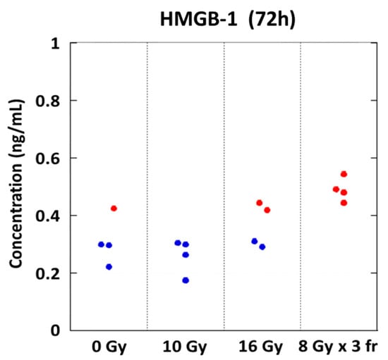 The cell culture supernatants were collected 72 h after irradiation. ELISA was performed using the Mouse/Rat HMGB1 ELISA kit (Arigo biolaboratories, Taiwan) to detect an amount of released HMGB-1 for 0 Gy (N = 3), 16 Gy (N = 4), and 8 Gy × 3 fr (N = 4).